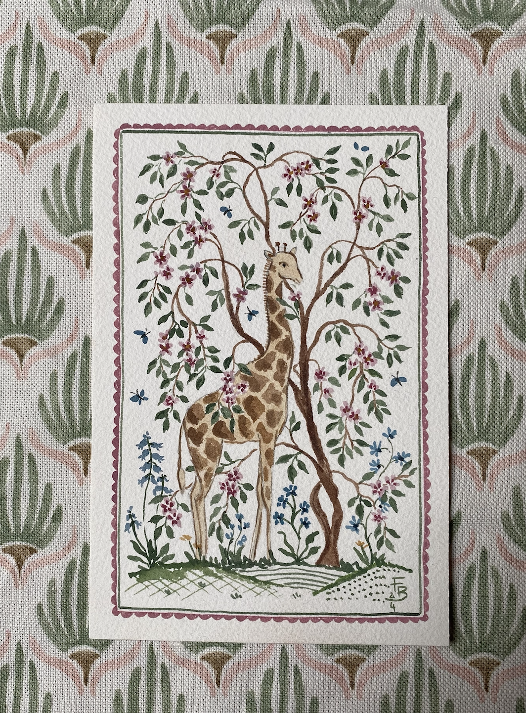 Miniature Watercolour painting - Giraffe and blossom tree