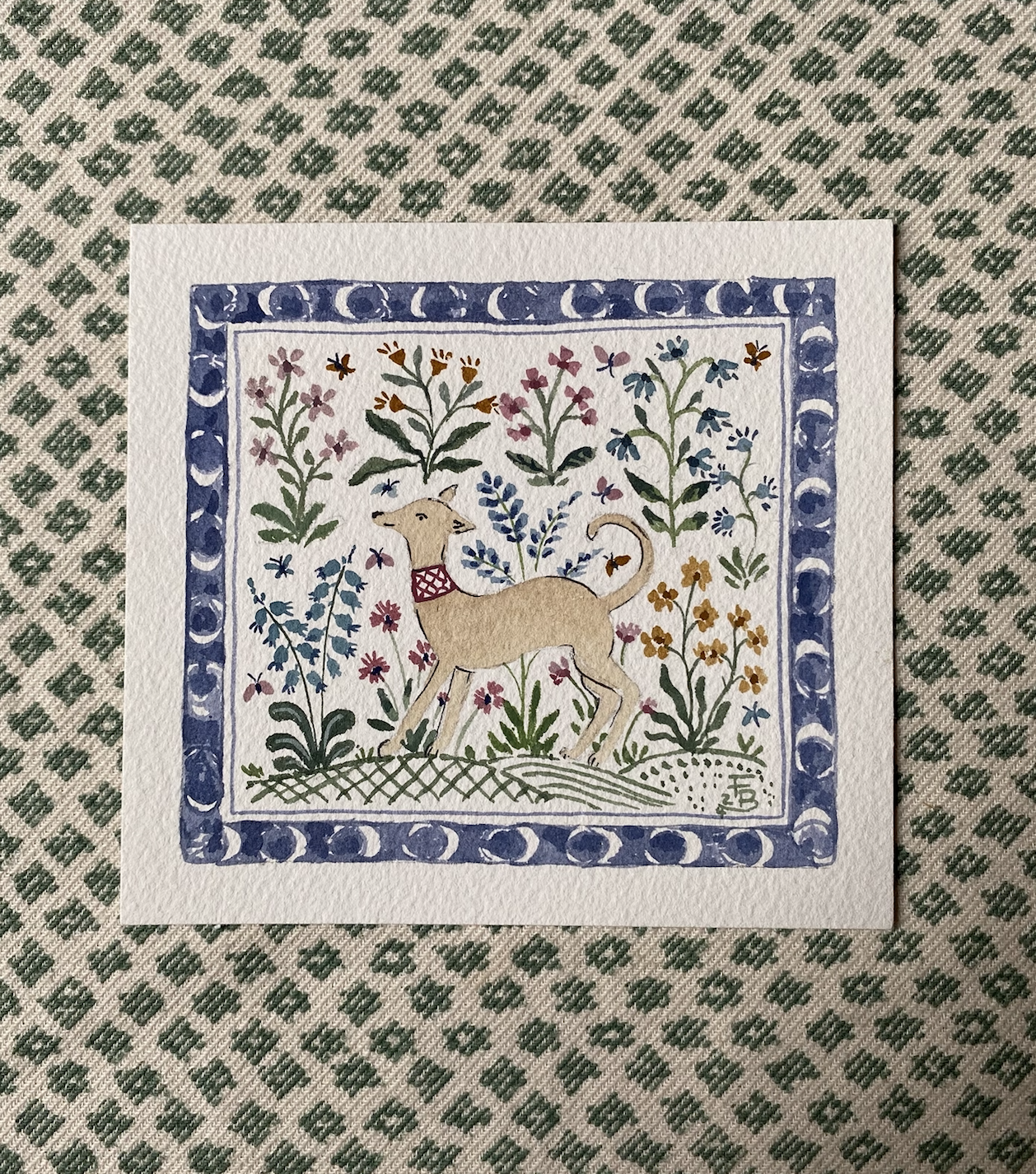 Miniature Watercolour painting - Whippet and wild flowers