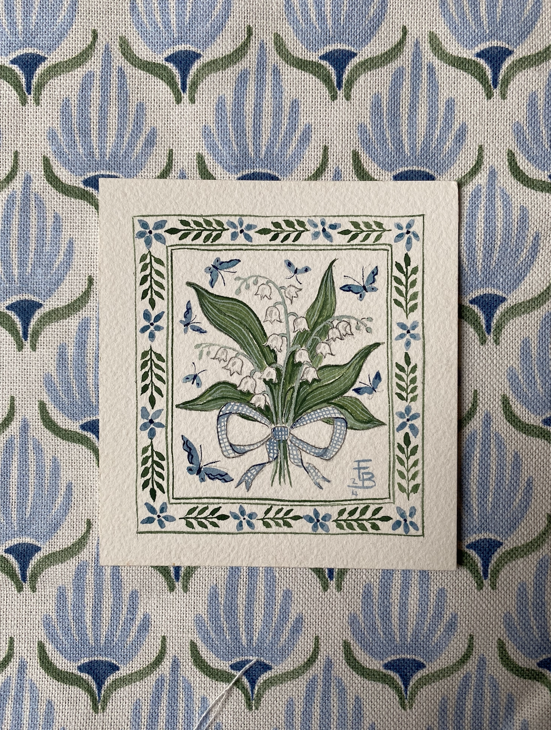 Miniature Watercolour painting - Lily of the valley with gingham bow